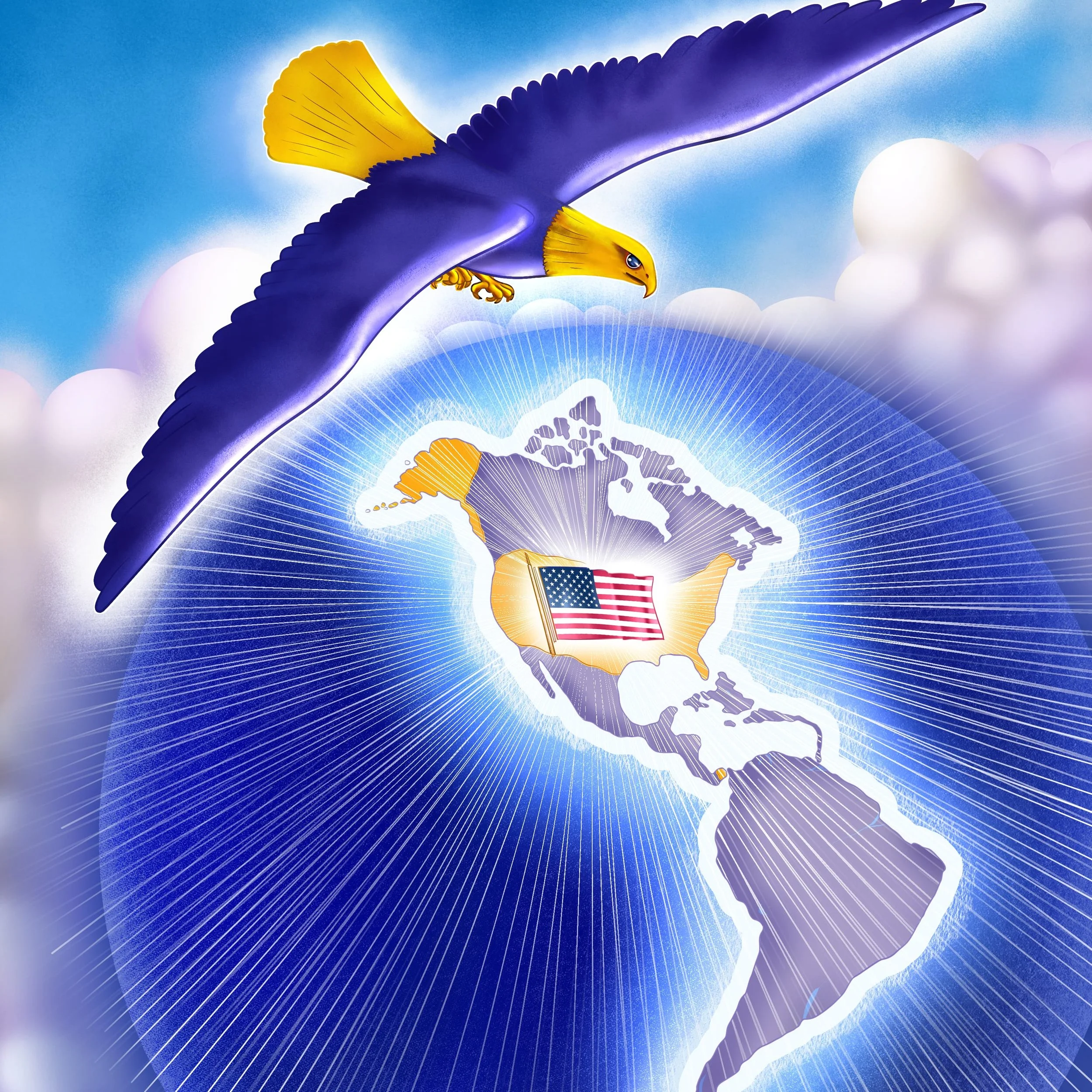 The celestial background behind the eagle and the deep, cosmic blue surrounding the globe frame the entire scene in a timeless, almost prophetic dimension. The image suggests that this rebirth is not merely a historical event but a defining moment on a broader, cosmic scale. The eagle thus becomes a luminous manifestation of the ascending national soul, and America—a beacon of global transformation.